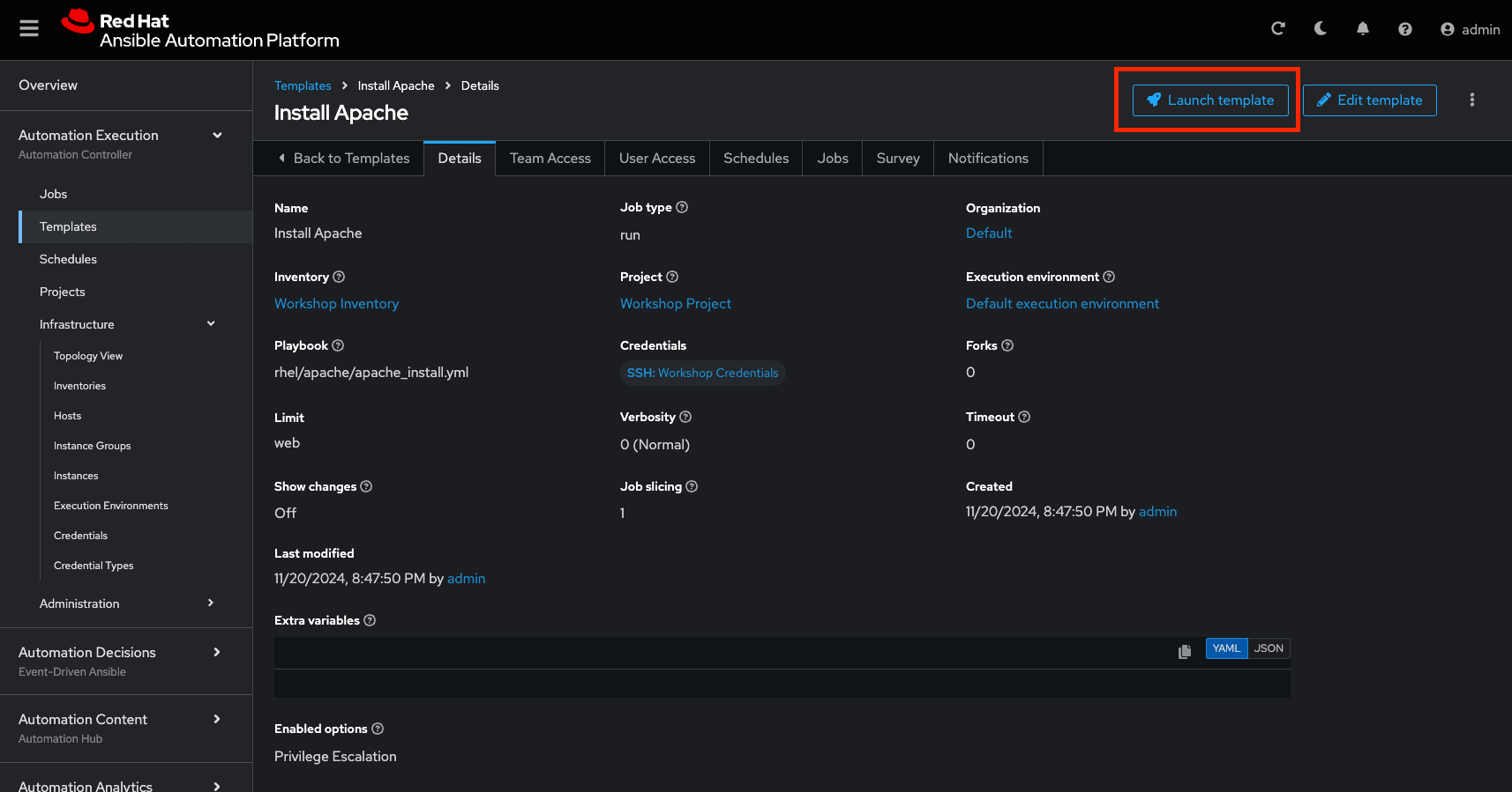 All details of the job template like inventory, project, credentials and playbook are shown.
